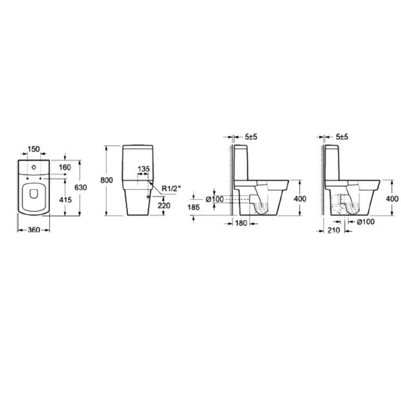 Close-coupled toilet, back and vertical outlet, in a square shape. Includes a soft close cover and a low-pressure cistern. With a smooth and shiny surface and easy to clean because porcelain is a minimally porous material and microbes do not easily penetrate.