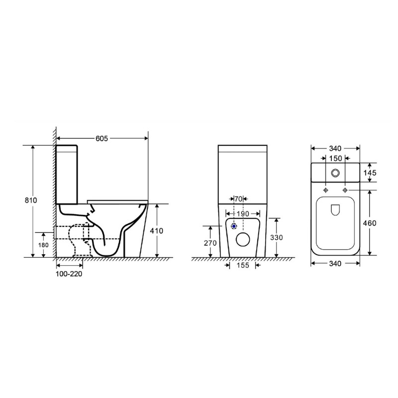 Close-coupled toilet, back outlet, in a square shape. It is rimless, meaning it does not have an inner rim and so the water injected from the cistern covers a larger part of the basin and cleans better. Includes a soft close cover and a low-pressure cistern. With a smooth and shiny surface and easy to clean because porcelain is a minimally porous material and microbes do not easily penetrate.