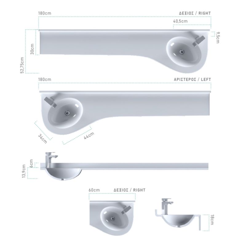 - Each washbasin is produced individually and cut to the unique dimensions that specifically suit each space. Depending on the model, there is the possibility of "moving" the basin to exactly the position desired by the customer.